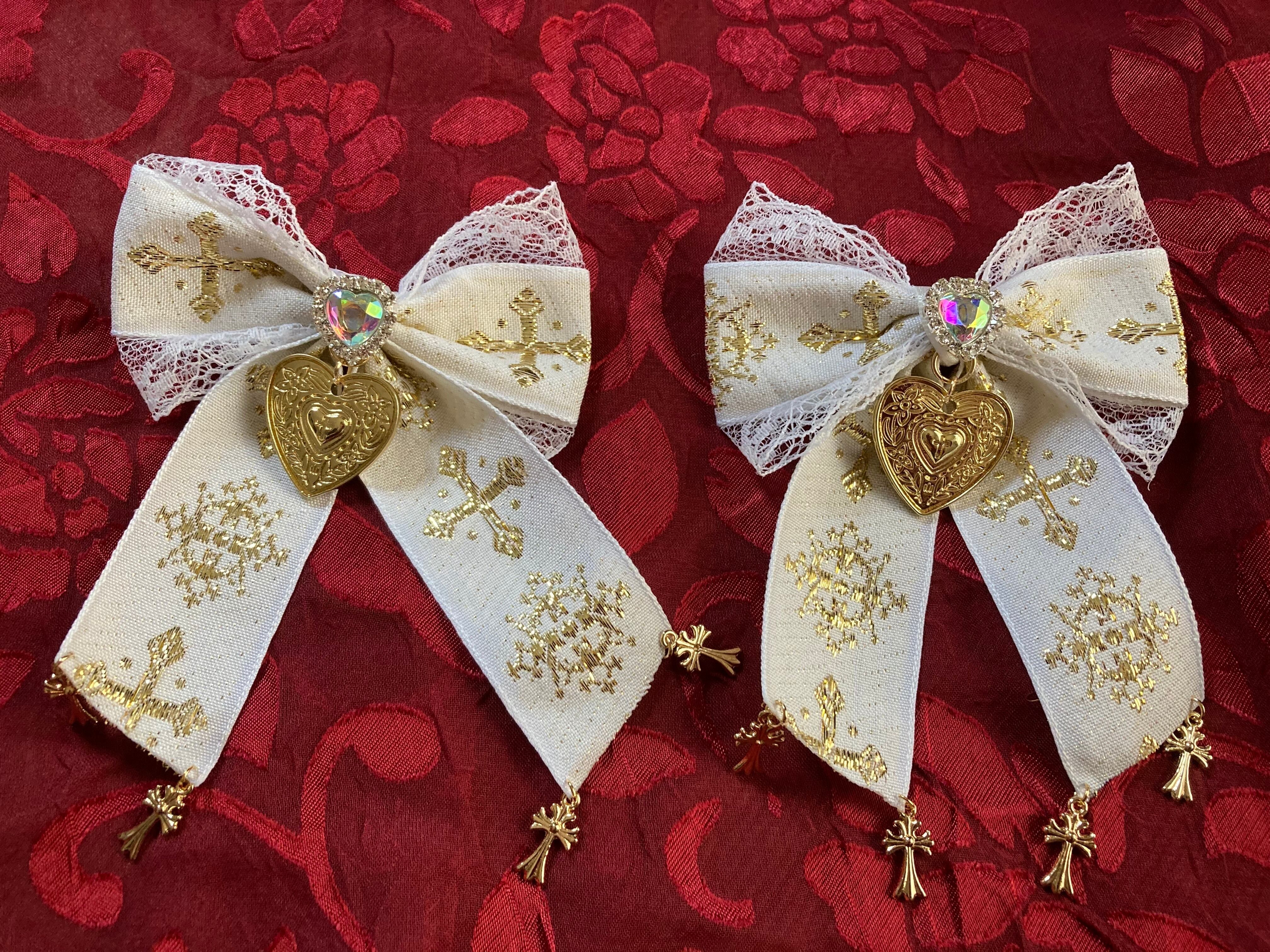 十字架 リボン ホワイト ハンドメイド ゴールド ビジュー クロス