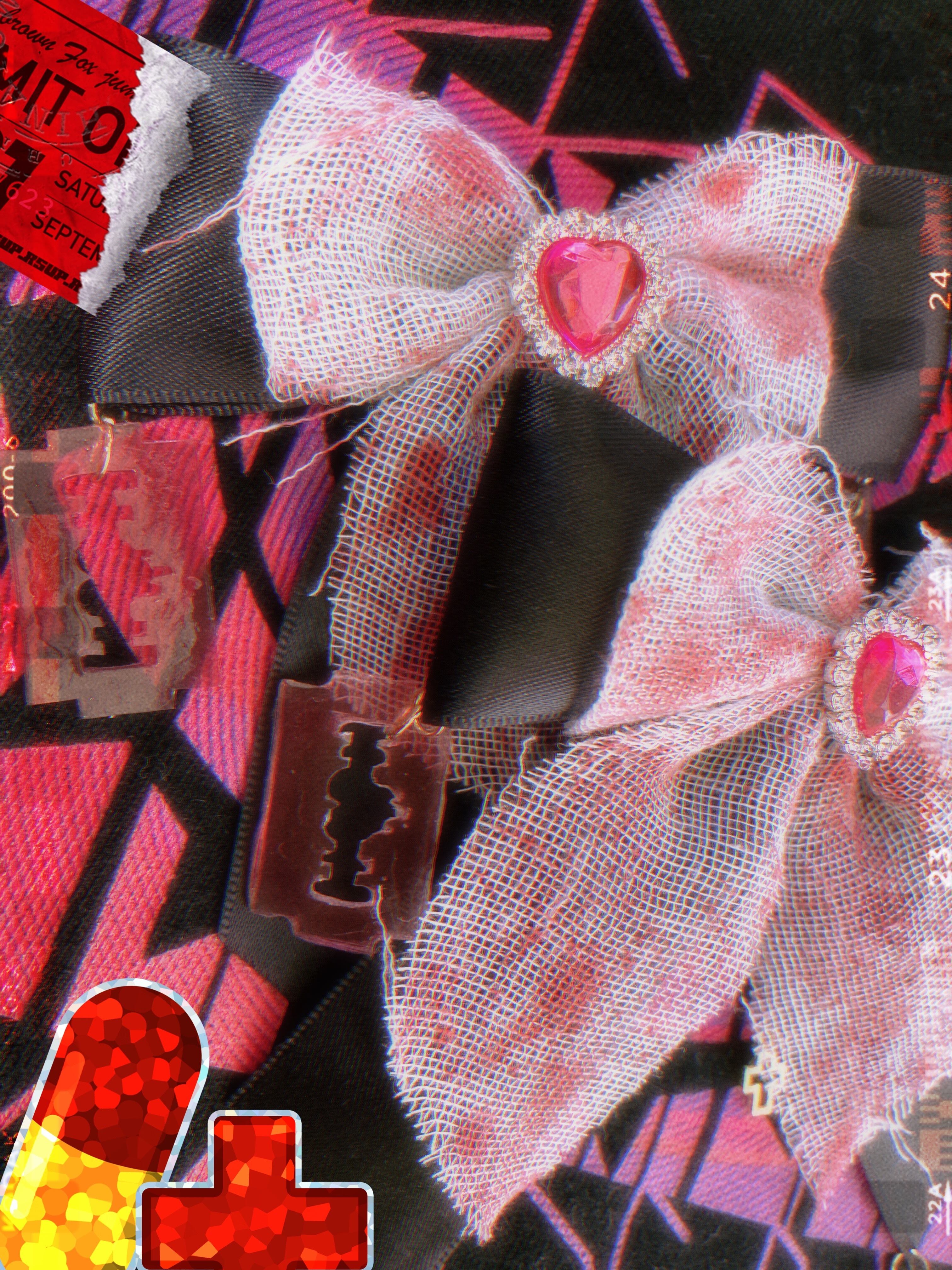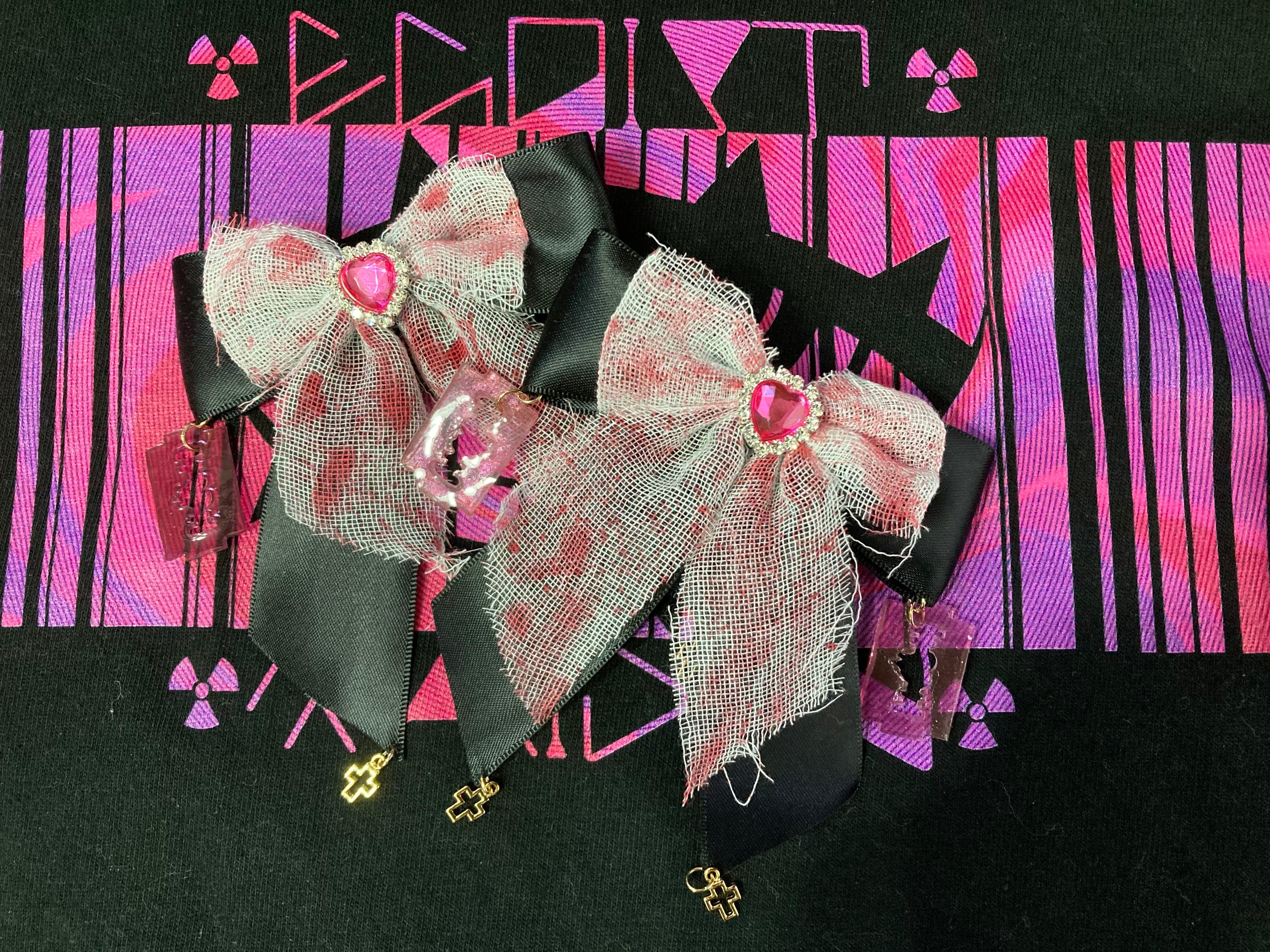 ハンドメイドリボン 返り血 ブラック カミソリ チャーム付き ハート ビジュー 十字架 メンヘラ サブカル 地雷系 ハロウィン