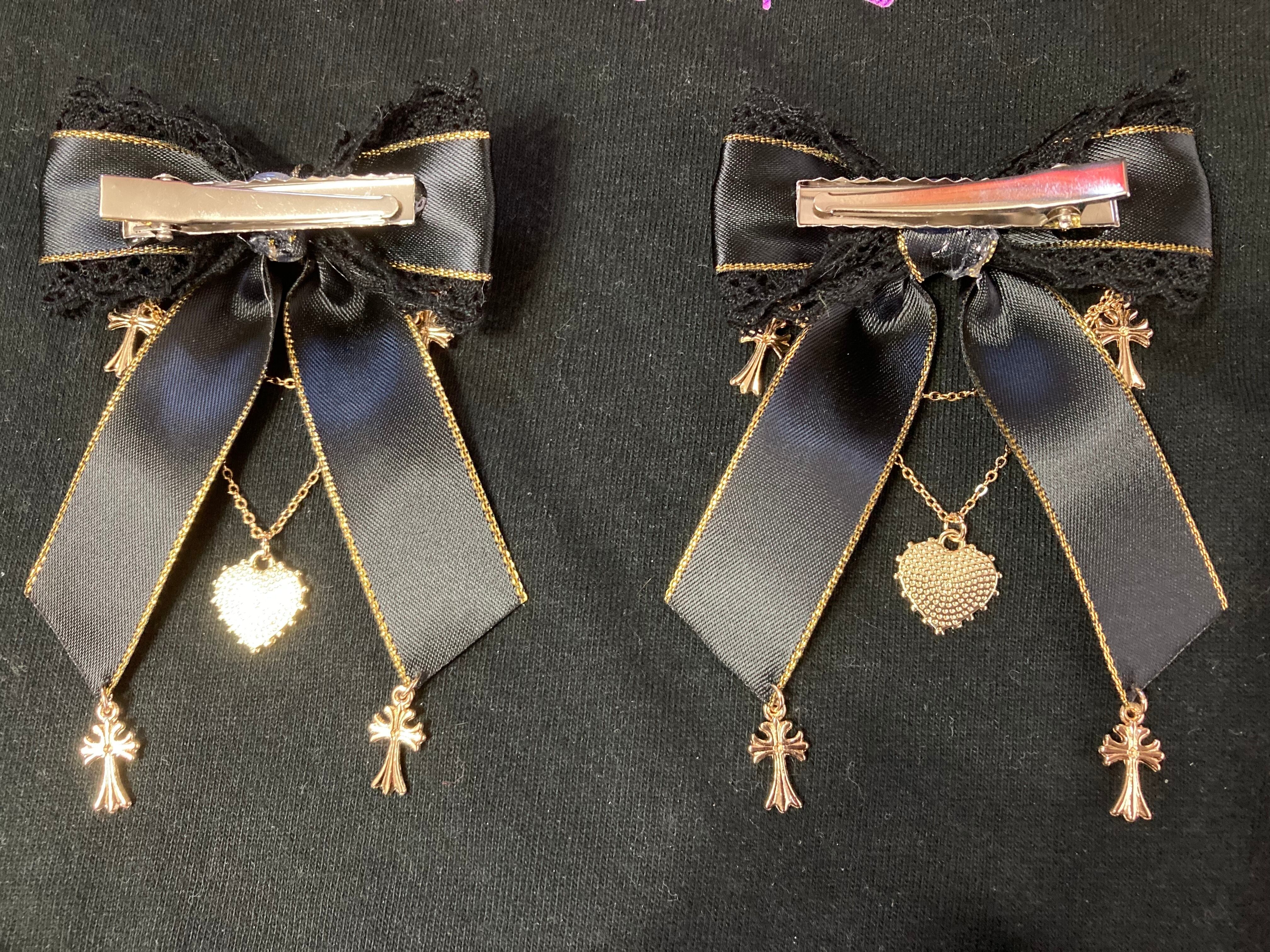 ハンドメイドリボン ブラック ゴールド レース 十字架 クロス ハート チェーン サブカル メンヘラ 地雷系